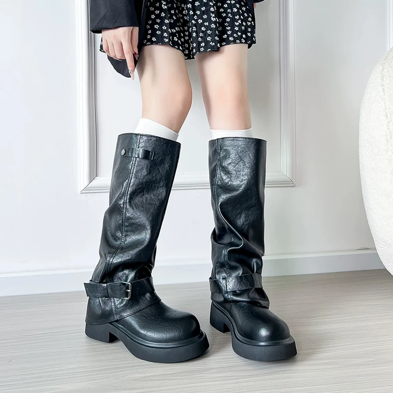 Женские высокие сапоги до колена «Челси», обувь на среднем каблуке, осень 2024, новые дизайнерские прогулочные модные мотоциклетные ботинки из искусственной кожи, Mujer