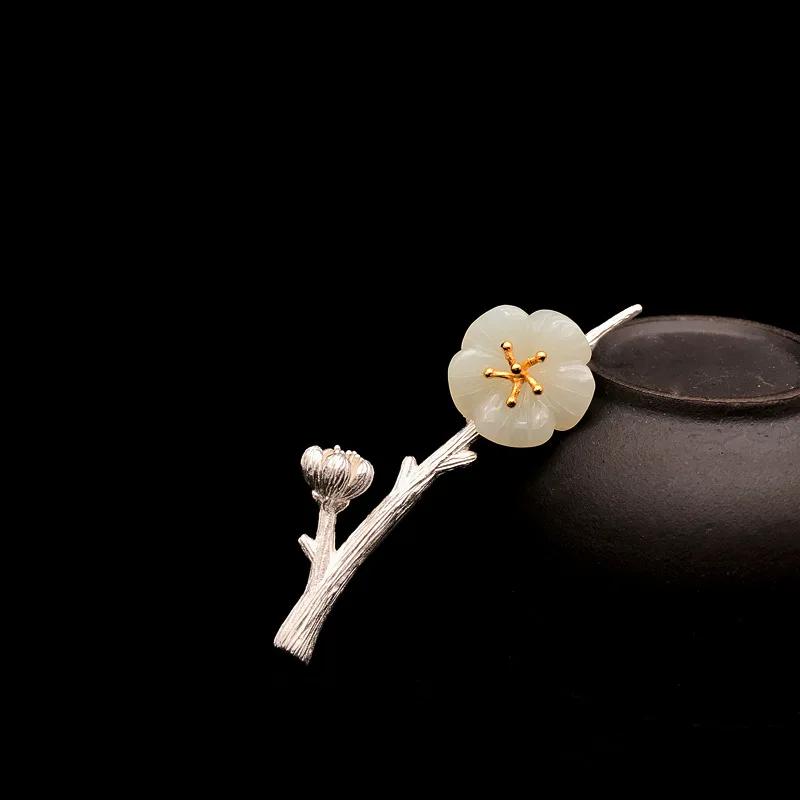 Винтажная брошь в придворном стиле с розовым кристаллом и цветком сливы, броши из натурального нефрита Хэтянь для женщин, классические ювелирные изделия в стиле легкой роскоши