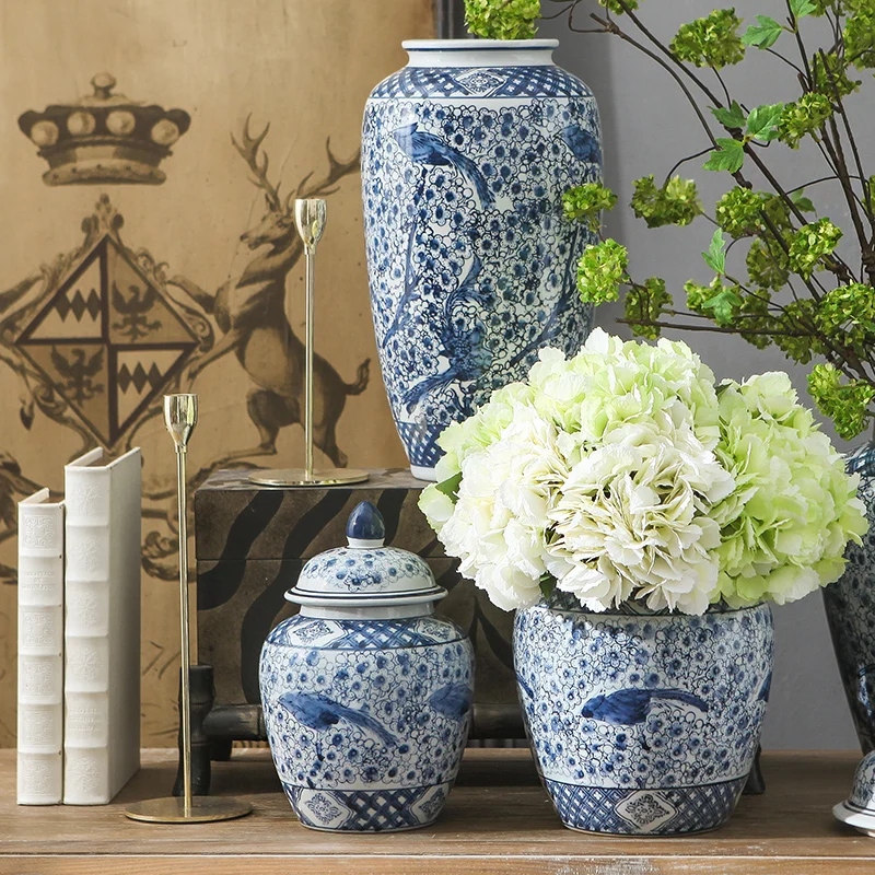 Винтажная керамическая ваза, синяя, белая птица, фотография с крышкой, Фарфоровая керамика, азиатская Восточная банка имбиря, вазы для цветов, Настольная Ваза