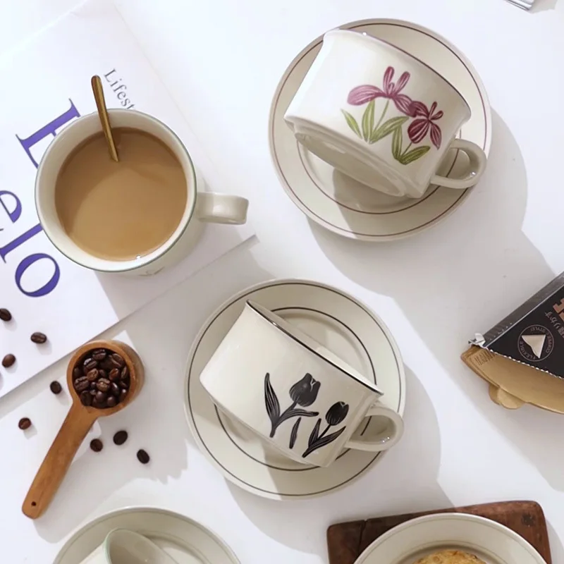 Винтажная керамическая кофейная кружка с цветочным принтом, высокоэстетичная чашка для чая для послеобеденной элегантности