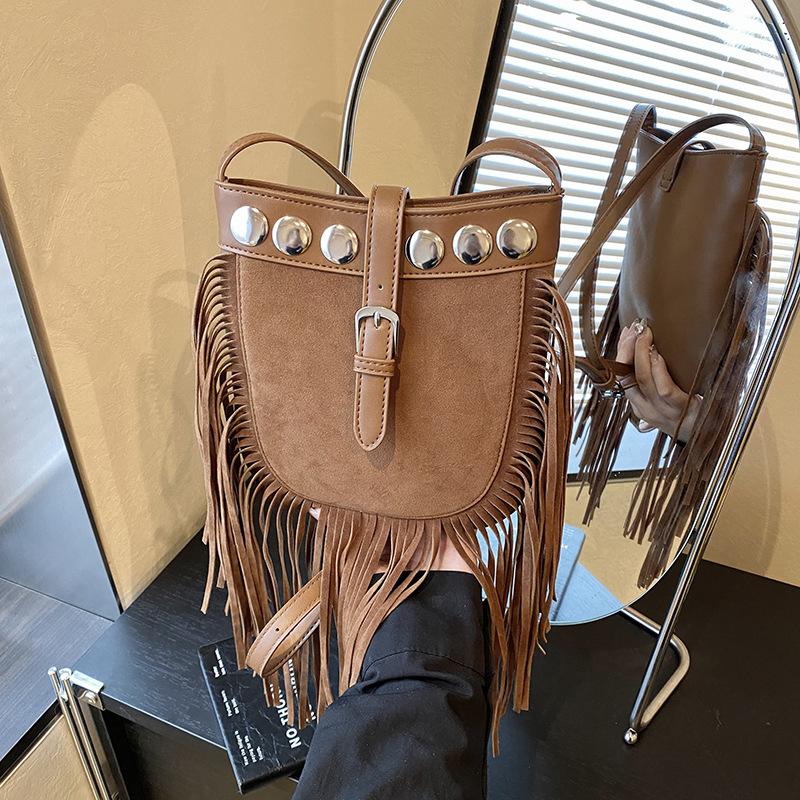 Винтажная матовая сумка женская осенне-зимняя новая сумка-мессенджер с кисточкой в богемном стиле на плечо, сумка-ведро коричневый