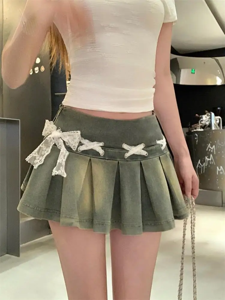 Винтажная синяя кружевная бант, элегантная плиссированная джинсовая короткая юбка, женская летняя корейская мода, тонкая сексуальная мини-джинсовая юбка трапециевидной формы с высокой талией