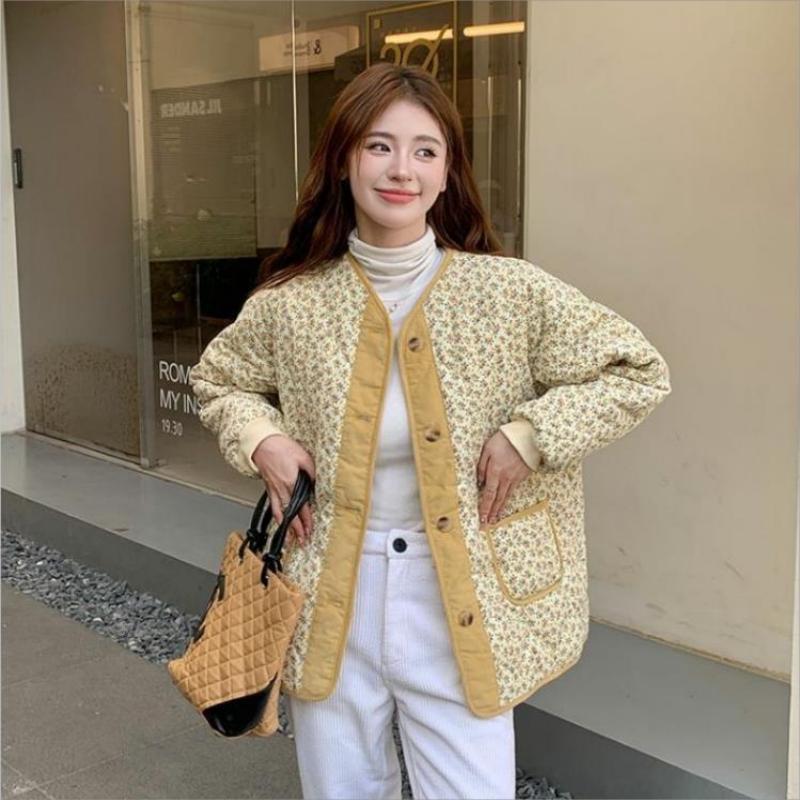 Винтажная стеганая куртка с желтым цветком, женская толстая теплая свободная зимняя хлопковая подбитая куртка, корейская однобортная парка, верхняя одежда S светло-желтого