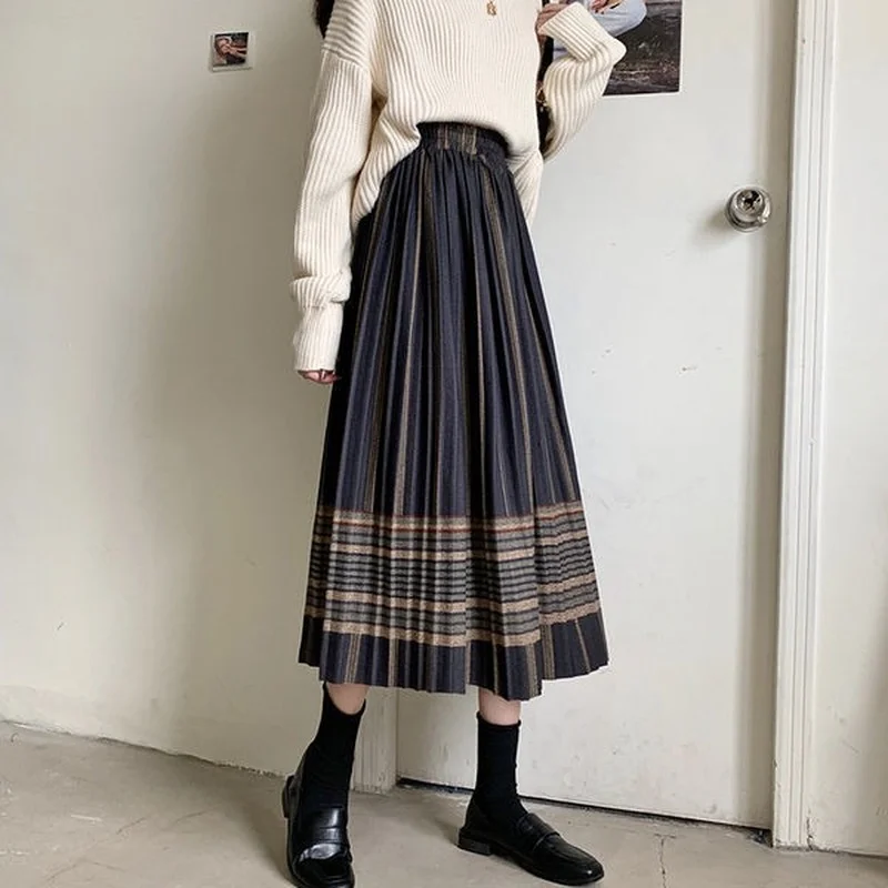 Винтажная шерстяная плиссированная юбка HOUZHOU, элегантная полосатая длинная юбка А-силуэта с высокой талией в стиле бохо, осень 90-х, в стиле п...