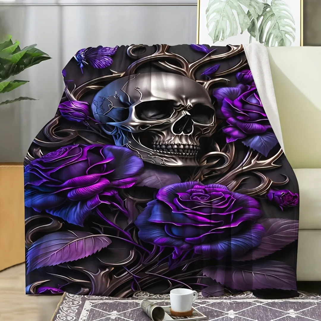 Винтажное готическое мягкое флисовое одеяло с принтом фиолетовой розы и черепа, можно стирать в машине, многоцелевое офисное, уличное и туристическое одеяло