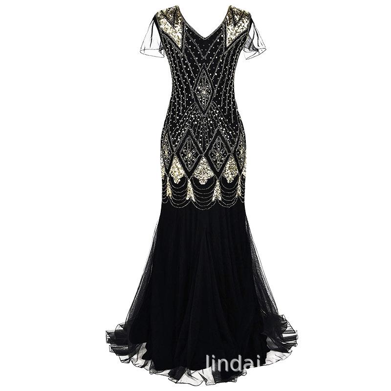 Винтажное женское вечернее платье с пайетками и шлейфом «рыбий хвост» 1920-х годов для банкетов и вечеринок. Large чёрный/золотой
