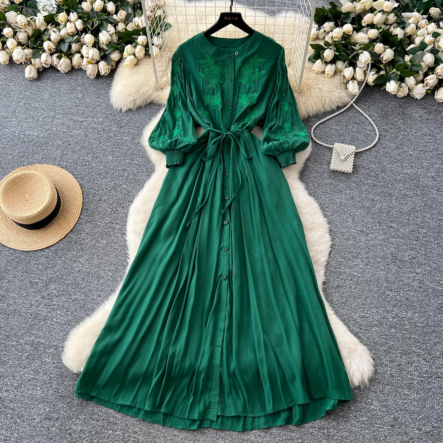Винтажное элегантное платье на пуговицах с вышивкой А-силуэта, шикарное, повседневное, для пляжного отдыха, женские летние платья One Size темно-зеленого