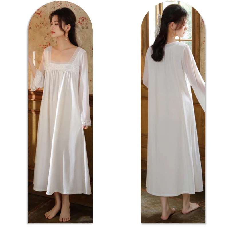 Винтажные ночные рубашки в викторианском стиле, Женская Осенняя розовая, синяя, белая хлопковая ночная рубашка, Сказочная сетчатая пижама с длинным рукавом для принцессы, пеньюар