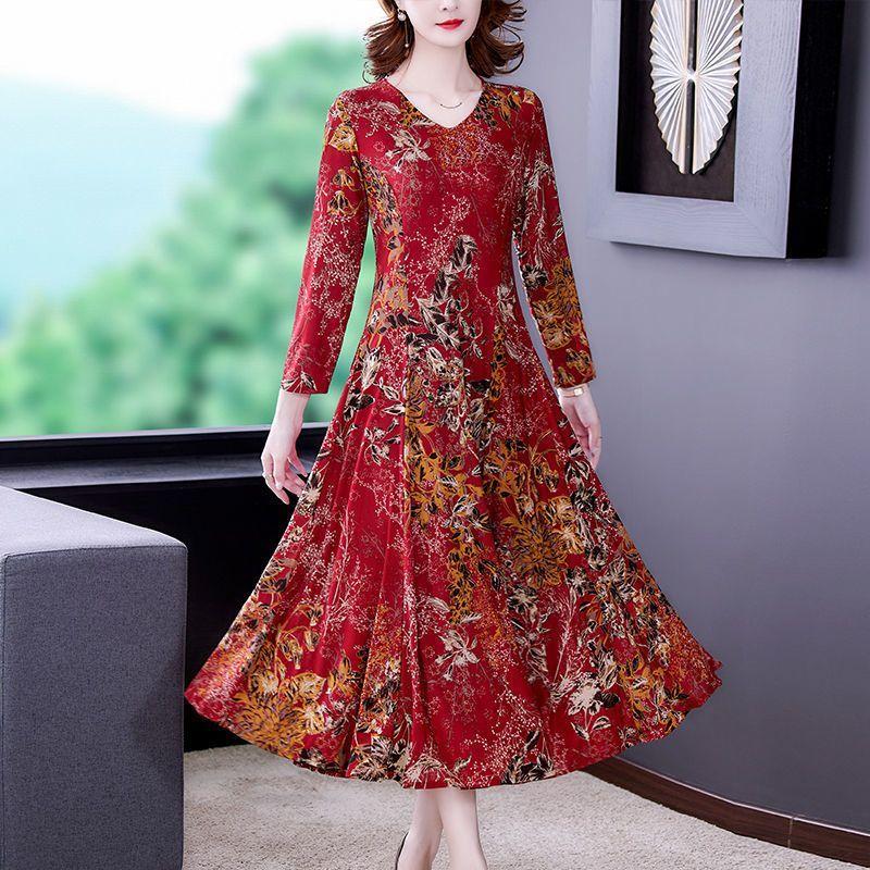 Винтажные платья с цветочным принтом Весна Осень Длинный рукав Женская одежда Приталенное Элегантное V-образный вырез Стильное А-силуэт Талия Длинное платье XXL красный