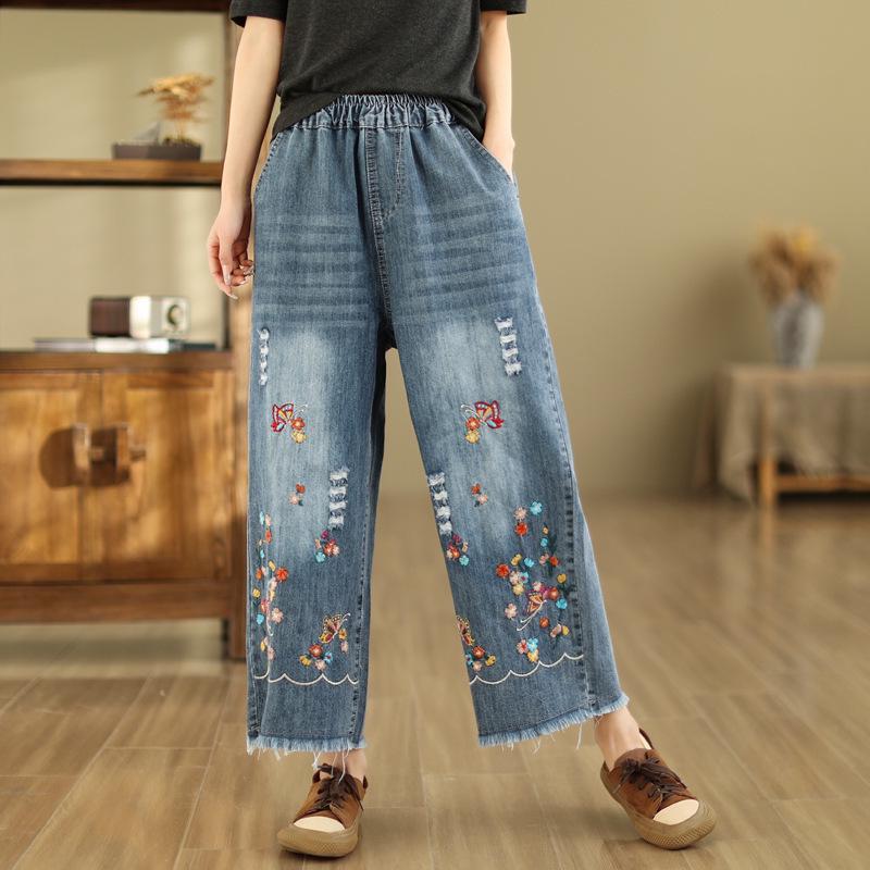 Винтажные этнические вышитые джинсы широкого кроя с эластичной талией и рваными элементами для женщин, больших размеров, длиной до щиколотки Extra Large