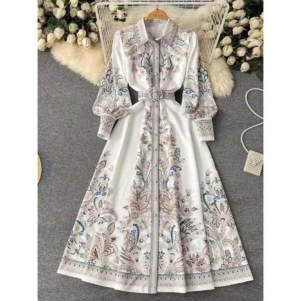 Винтажный цветочный принт зеленое вечернее платье женское отложной воротник длинный рукав-фонарик пуговицы пояс бохо халат Vestidos XXL