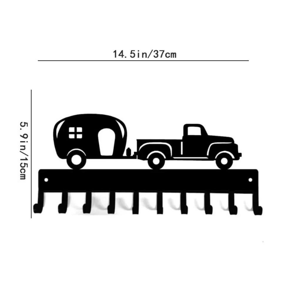 Винтажный Pick Up & Camper - Вешалка для ключей - XL 14,5 дюймов в ширину Металлическая настенная картина Четырнадцать точек Винтажный Pickup Camper Вешалка для ключей чёрный