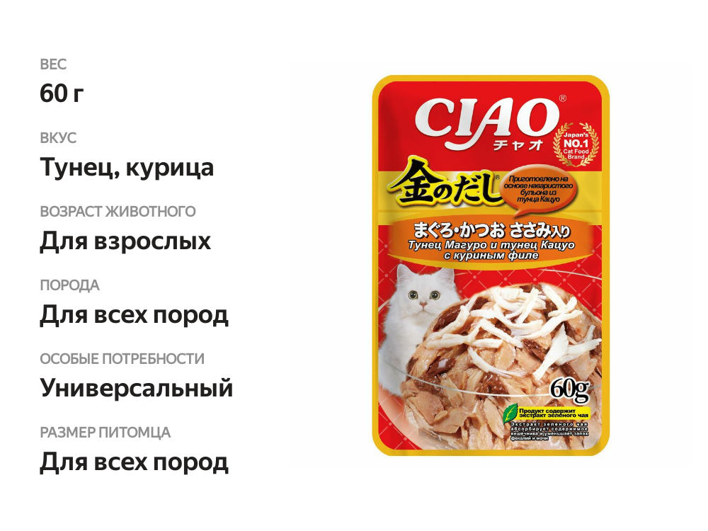 Влажный корм для кошек Inaba Ciao Kinnodashi Тунец магуро и Тунец кацуо с куриным филе 60 г