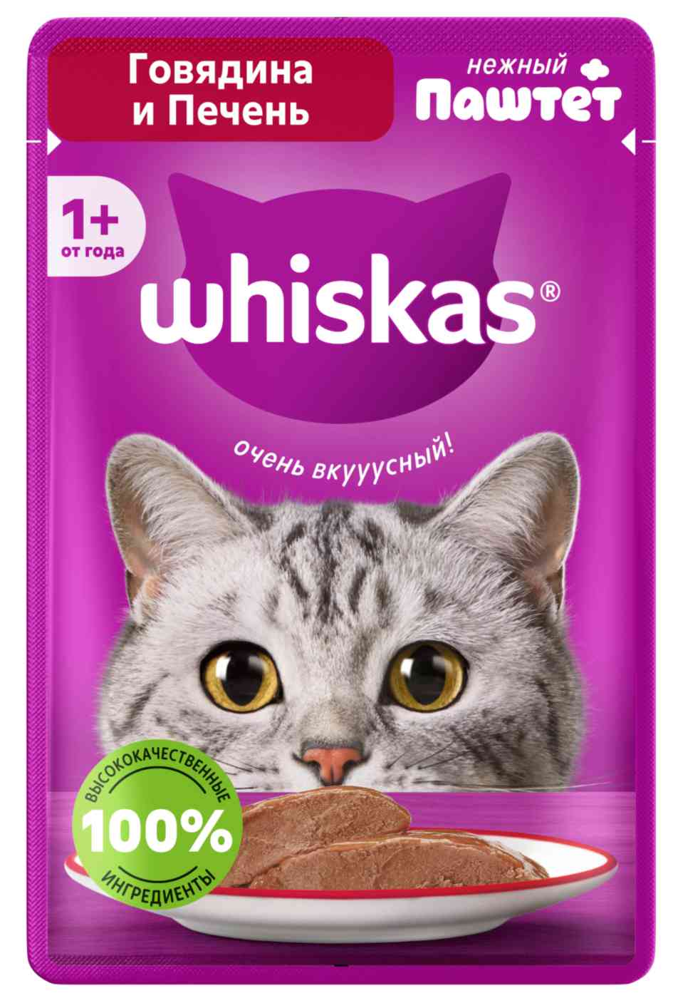 Это сбалансированный рацион, приготовленный именно так, как любит ваша кошка. Аппетитный паштет с говядиной и печенью подарит вашей любимице настоящее удовольствие. Жизнь замурррчательна, ведь рацион Whiskas содержит все необходимое, чтобы еда вашей кошки была не только вкусной, но и полезной. Whiskas поддержит иммунитет, позаботится о здоровом пищеварении и здоровье кожи и шерсти вашей кошки. Подходит для стерилизованных котов и кошек.Рационы Whiskas для взрослых кошек это:- 100 % натуральные высококачественные ингредиенты: мясо и субпродукты – без добавления ароматизаторов, искусственных красителей и консервантов.- Оптимальный баланс питательных веществ для полноценной жизни.- Всё необходимое для поддержания здоровья вашей любимицы: Омега-6, кальций, фосфор и таурин, витамин D и Е, цинк.Ваша кошка будет мурчать от удовольствия!