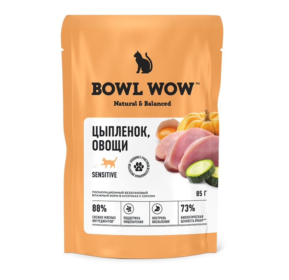 Влажный корм Bowl Wow для кошек с чувствительным пищеварением Цыпленок овощи 85 г