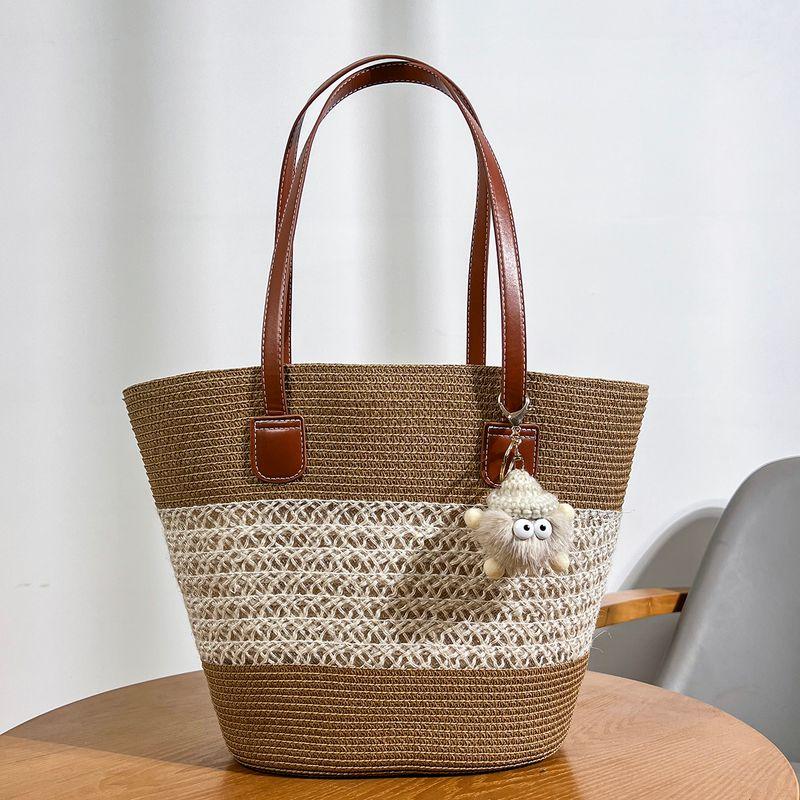 Вместительная плетеная сумка из соломы Женская летняя пляжная сумка-тоут для отпуска Сумка-ведро Плетеная сумка через плечо Кукольная пляжная сумка Khaki Cut Out