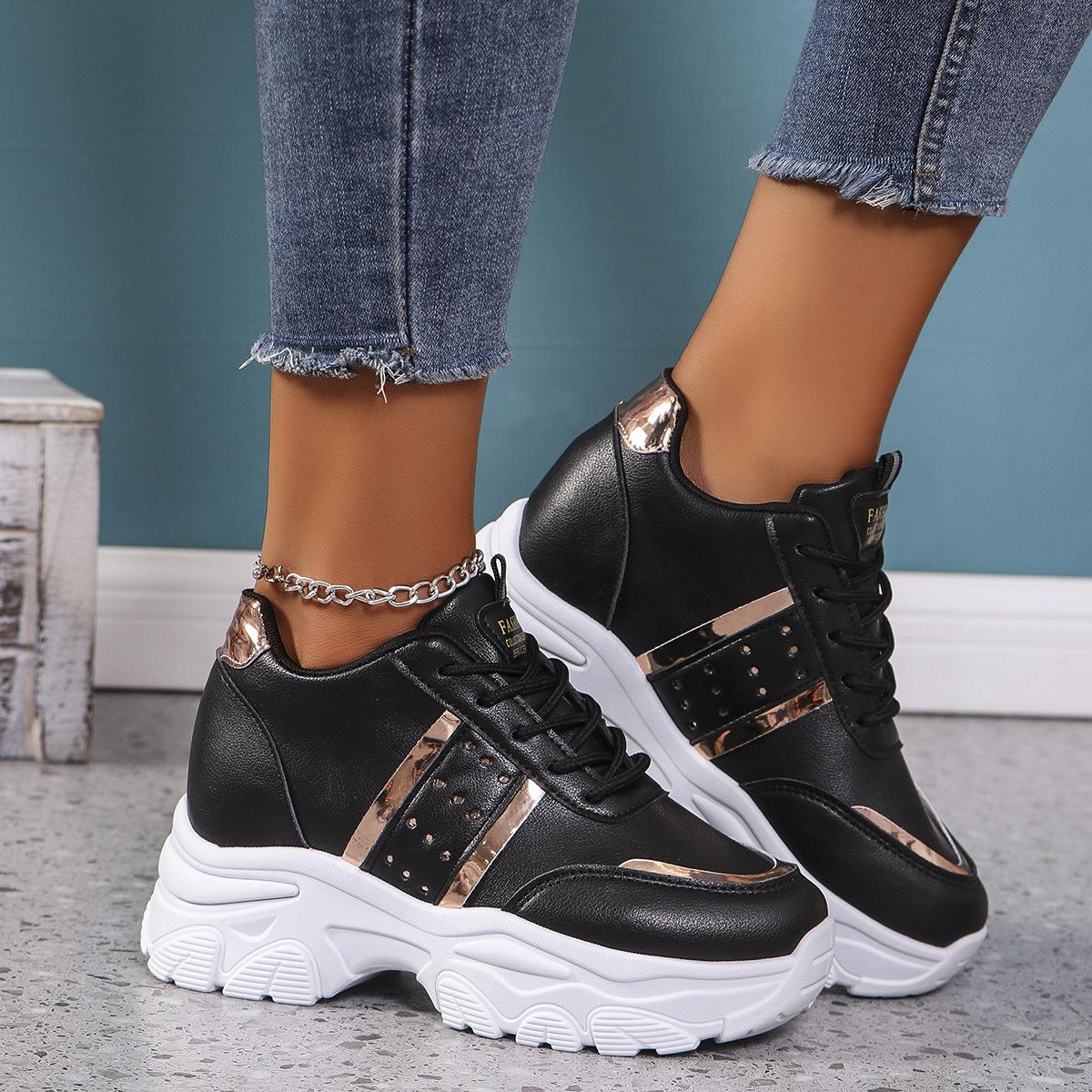 Внутренние спортивные туфли, увеличивающие рост, женские, осень-зима 2025 года, новые кожаные туфли на толстой подошве белого цвета, большого размера, подходящего цвета, яркая полоска спереди 42 чёрный