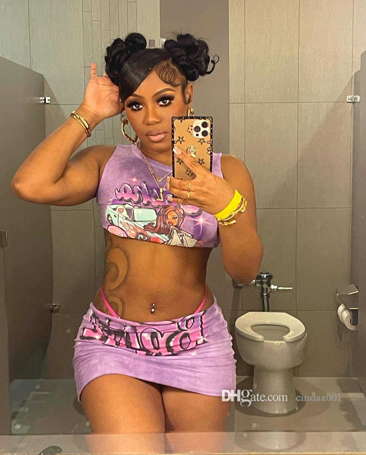 Summer New Street Trendy Dress Suit Round Neck Sleeveless Character Letter Print Wrapped Hip Skirt Set, Picture color