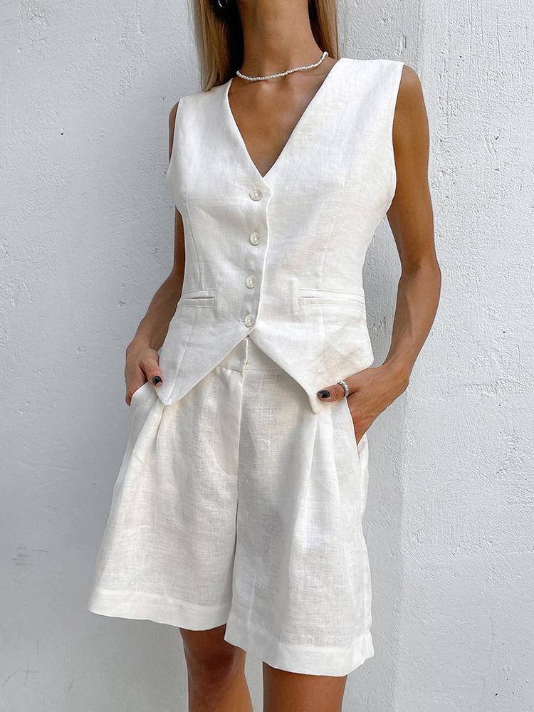 Women' Tracksuits Foridol Pockets Fashion White Cotton Linen Vest Shorts Set Summer Buttons Wide Leg Outfits 2 Pcs Women Suit 2023, Blue