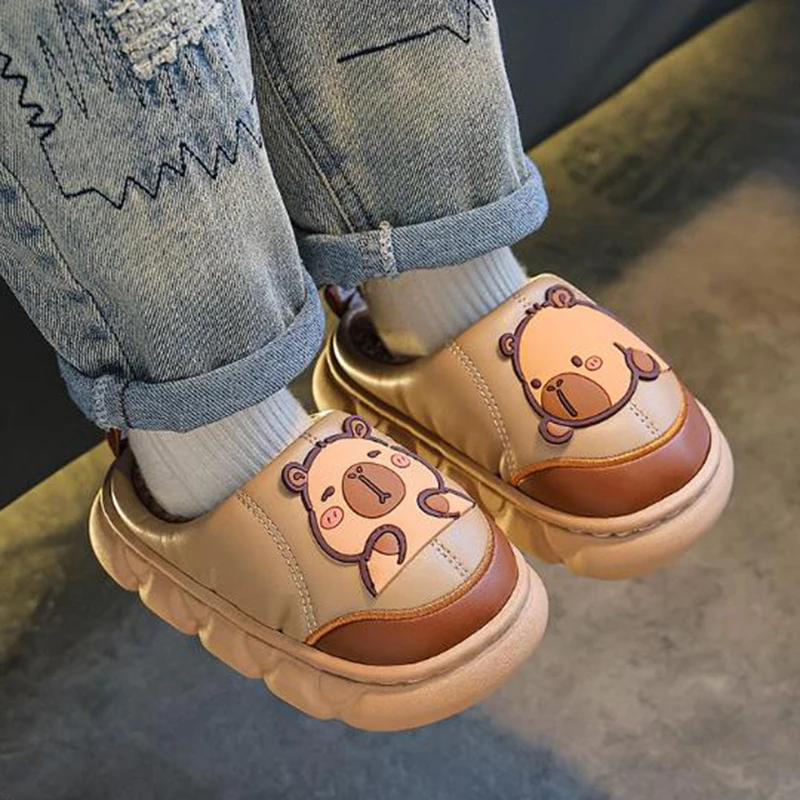 Водонепроницаемые нескользящие домашние тапочки из искусственной кожи с толстой подошвой, детские зимние теплые длинные плюшевые тапочки 2025 года, милые шлепанцы с капибалой для мальчиков
