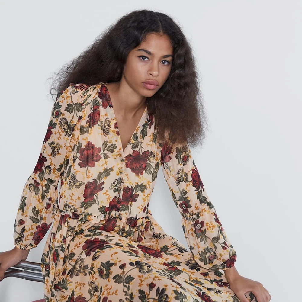 2019 ZA Long Sleeve V-Neck Long Dress for Women Boho A -Line Style Fashion Print Pleated Decoration Charm Autumn Style Dress