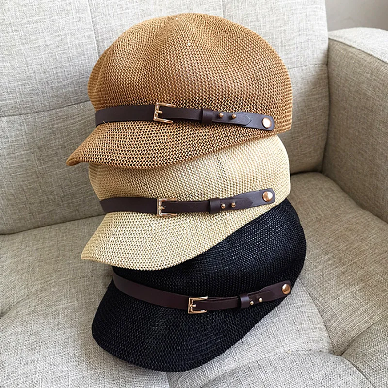 Восьмиугольная женская Соломенная Кепка, летняя тонкая кепка газетчика, Регулируемая Веревка, вязаный берет, сетчатая дышащая пляжная соломенная шляпа