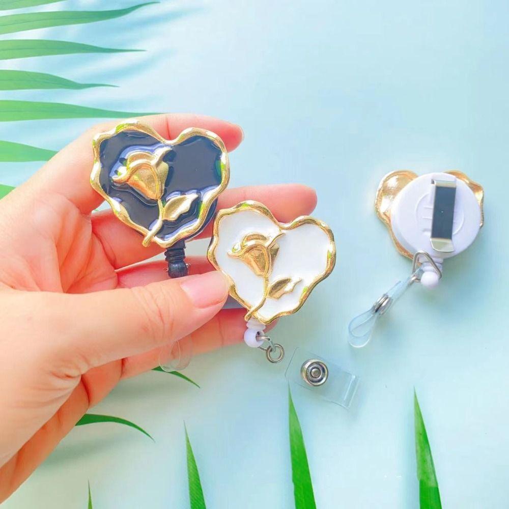 Выдвижная катушка для бейджа в форме сердца с розой, именная бирка, легко вытягиваемая пряжка, держатель для удостоверения личности, офисные принадлежности фиолетовый
