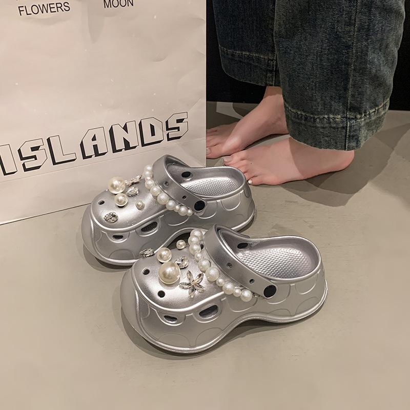 Высокая ценность, изысканный темперамент, туфли с отверстиями в виде маленьких цветков со стразами, женские летние шлепанцы на небольшой толстой подошве, нескользящие и легкие 40-41 серебряный
