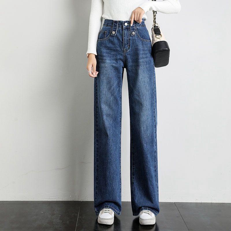 Высокие женские джинсы с широкими штанинами и высокой посадкой – Модные свободные прямые драпированные брюки Осень 2020 Size 32 темно-синий
