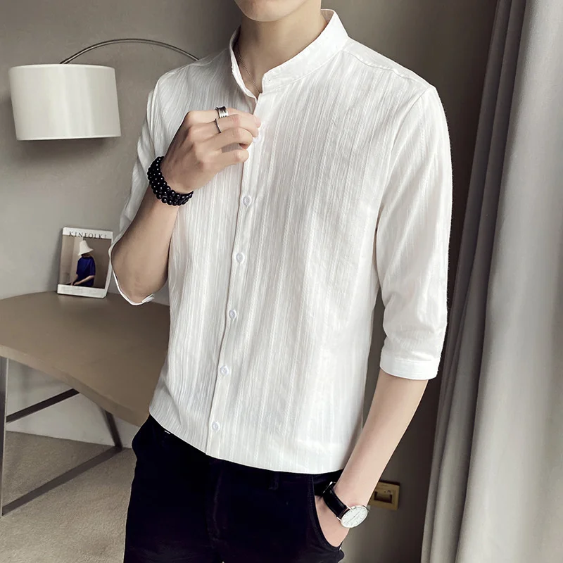 Высококачественная Белая мужская Корейская приталенная короткая летняя тонкая рубашка три четверти модная красивая британская рубашка с ...