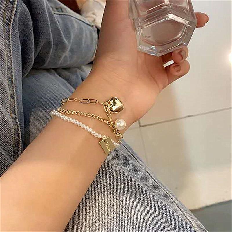 Link, Chain 1PCS Layered Pearl Heart Bracelet On Hand Boho Simple Design Letter Tag For Women Vintage Hip Hop Link Baubles