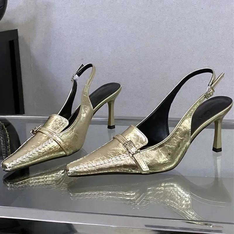 Высококачественная мягкая кожа Золото Серебро Высокие каблуки Женские Сексуальные Острый носок Украшение ремешком с пряжкой Босоножки на каблуке Офисные женские туфли 39 золотой