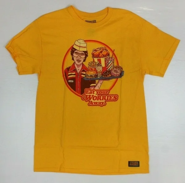 Steven Rhodes Gear Eat Your Worries Humor Retro Yellow Orange T-Shirt New! (5B2