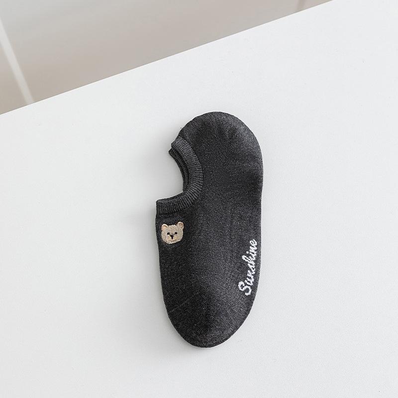 Вышитые милые носки-след с маленьким медведем для девочек, весна и лето, с мелким вырезом, приятные к коже, тонкий силиконовый противоскользящий дизайн на пятке, без перепада высоты пятки 1 pair серый/чёрный