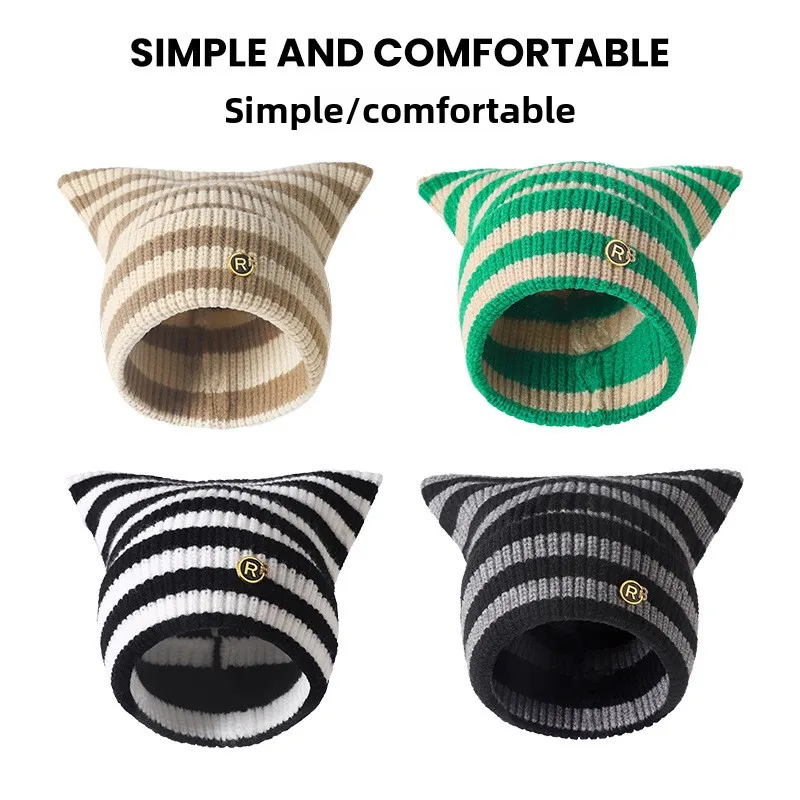 Вязаная крючком шерстяная шапка «Маленький дьявол» в японском стиле с милыми кошачьими ушками, в полоску, осень и зима, теплая, визуально уменьшает лицо