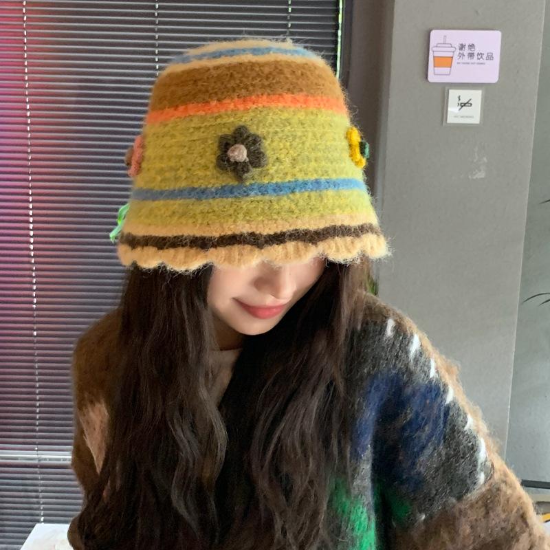 Вязаная панама с цветочным узором, женская японская милая и симпатичная контрастная цветная панама, универсальная маленькая шерстяная шапка Tide