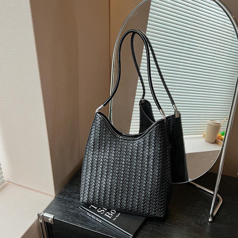 Вязаная сумка-тоут большой вместимости, женская летняя новая повседневная сумка через плечо под мышкой, сумка-ведро для通勤 чёрный