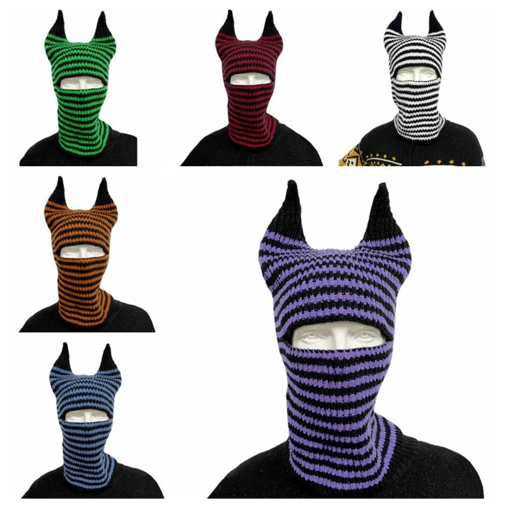 Вязаная шапка в полоску с коровьим рогом, многофункциональная теплая маска для шеи, универсальный платок на осень