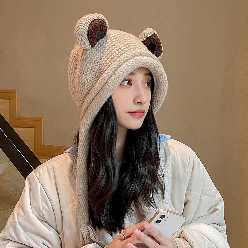 Вязаная шапка-лягушка женская с защитой ушей и лица от холода, теплая шерстяная шапка для велоспорта, мультяшная флисовая шапка, визуально делающая лицо худым Casual versatile, warm and elastic