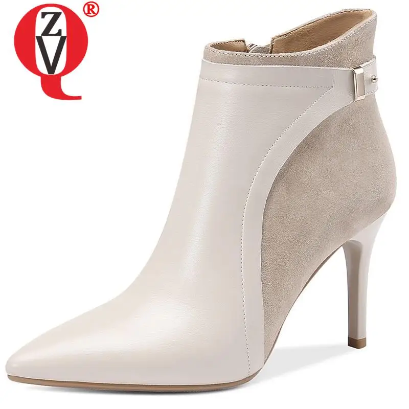 ZVQ/ботинки из коровьей кожи; Коллекция 2022 года; Модные пикантные ботильоны из флока с металлическими украшениями; Зимние туфли на высоком каблуке 8,5 см; Черно-Бежевые ботинки