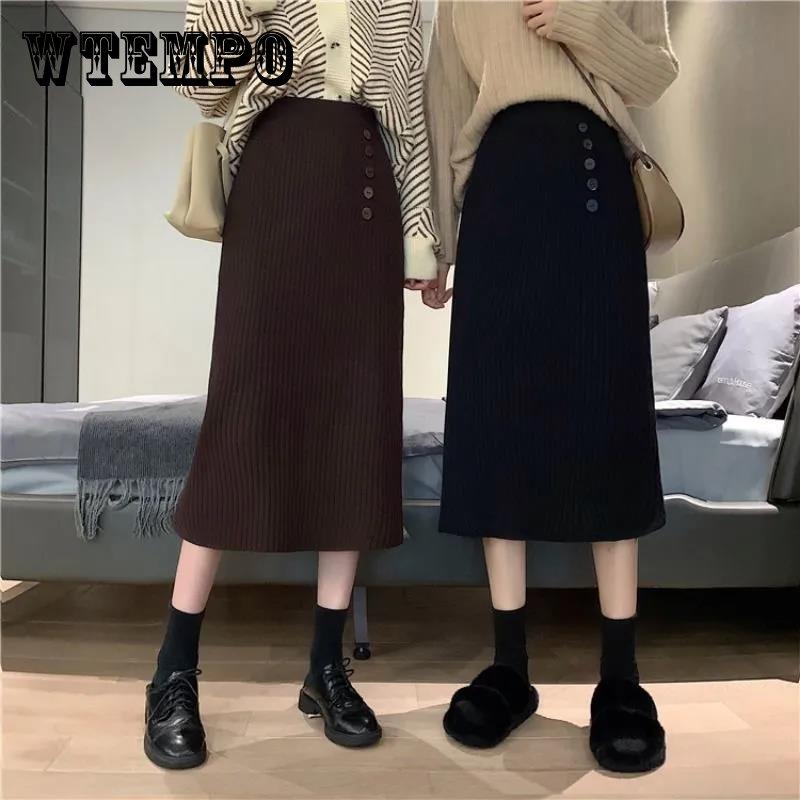 Вязаная юбка средней длины Осень и зима Женский корейский темпераментный комплект Бедро одношаговая юбка Дикая тонкая юбка трапециевидной формы средней длины с высокой талией