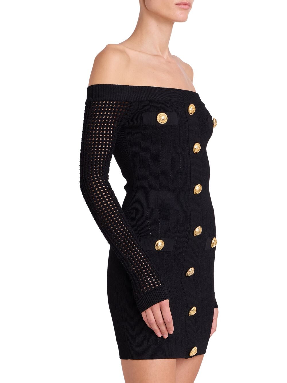Вязаное мини-платье с открытыми плечами Balmain, черный