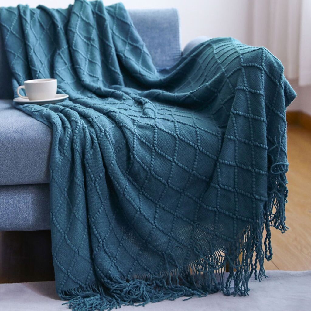 Вязаное одеяло для дивана, кресла, кровати, домашнего декора, мягкое, теплое, уютное, легкое, весна, лето, осень (синее) JedBesetzt