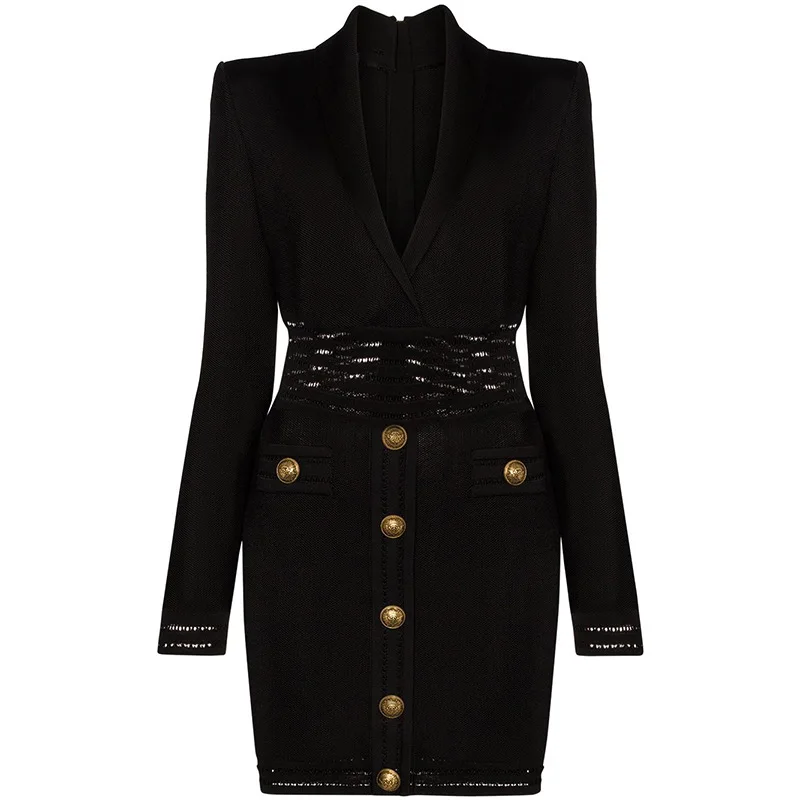 Вязаное платье с длинным рукавом Черная осень Новое темпераментное платье с глубоким v-образным вырезом и золотыми пуговицами Модное плать...