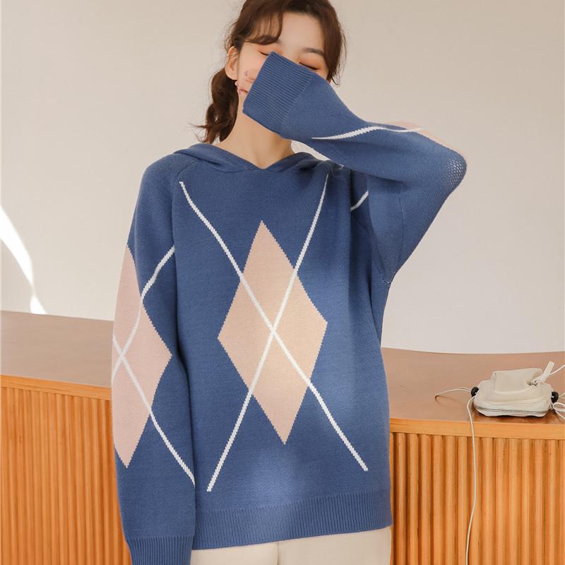 Вязаные свитера с капюшоном, пуловеры, женские весенне-осенние свободные топы с длинным рукавом в стиле ретро с ромбами, один размер