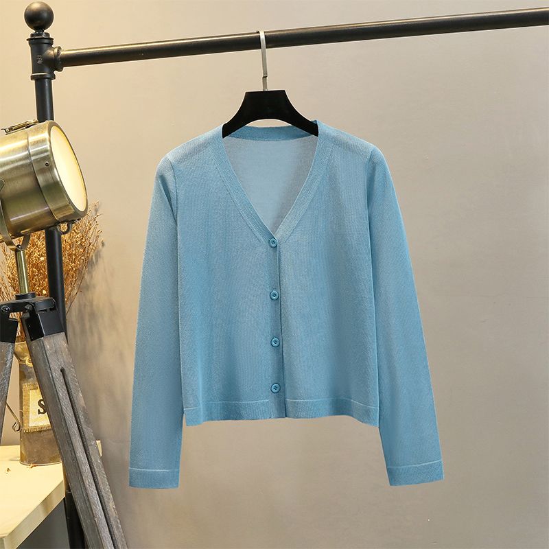Вязаный кардиган с защитой от солнца Женская тонкая летняя рубашка для помещения с кондиционером Шаль из ледяного шелка Короткое пальто Юбка на подтяжках Верхняя одежда Накидка Свободный Blue(DC-8413) L