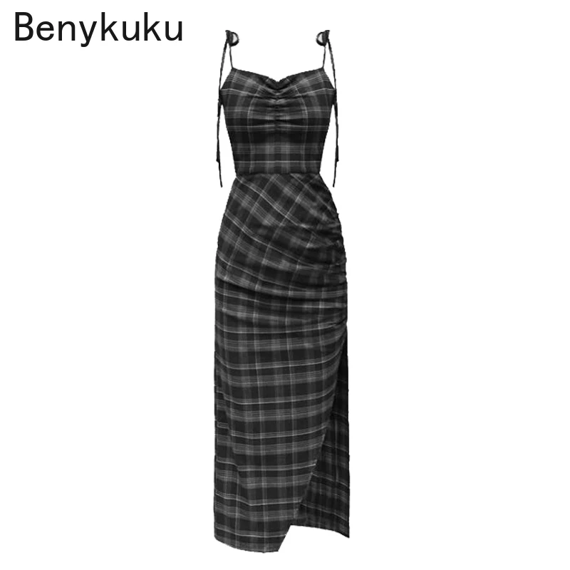 В стиле панк, готика, женская летняя обувь, чёрное клетчатое сексапильное платье Сексуальное нижнее белье с глубоким v-образным вырезом Вечерние Клубные темно с лямкой на шее элегантная женская обувь на высоких каблуках с талией Разделение миди платья