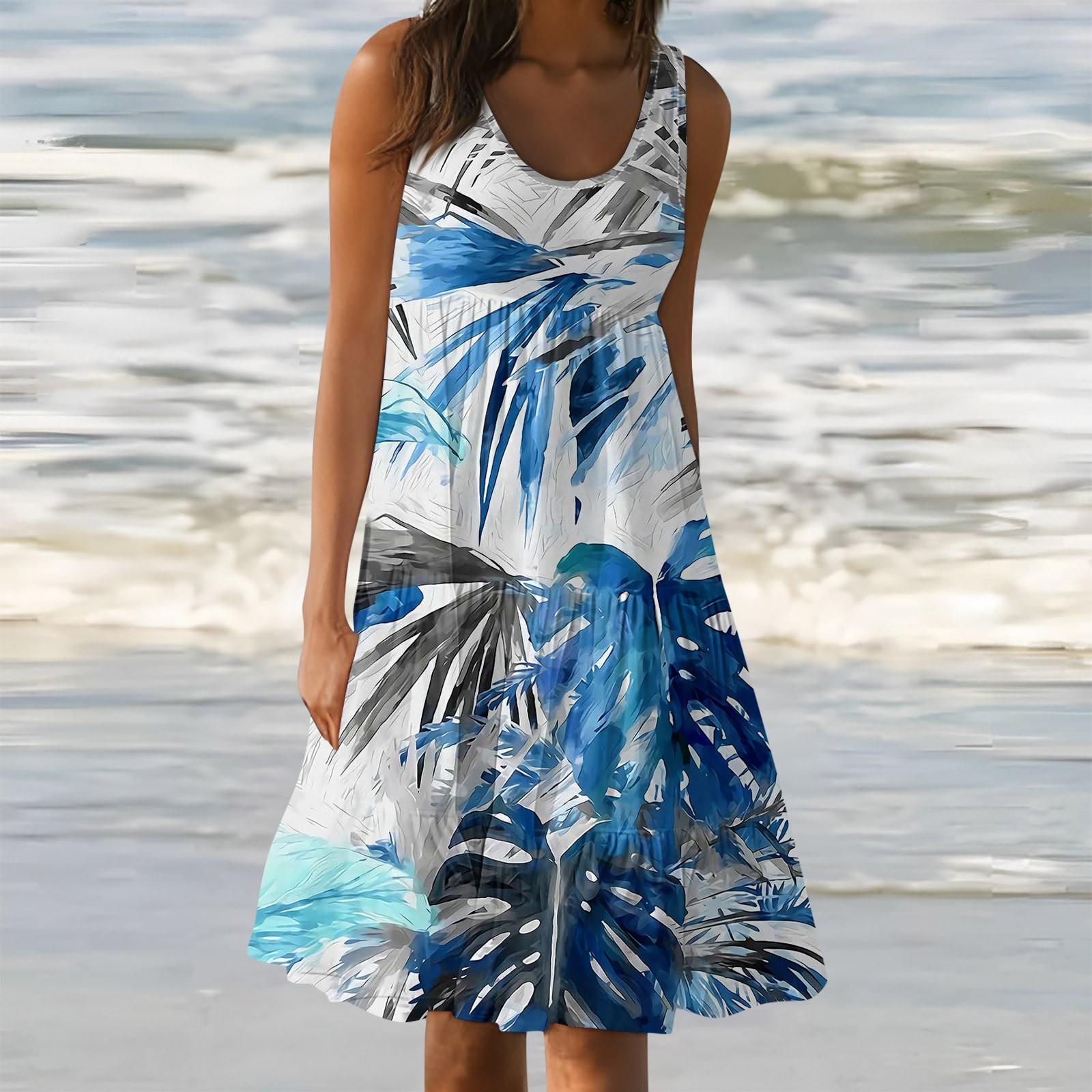 Гавайское платье для женщин, летние весенние плиссированные богемные платья, милые струящиеся пляжные платья без рукавов, прямая футболка, платья-майки, платья с круглым вырезом L синий