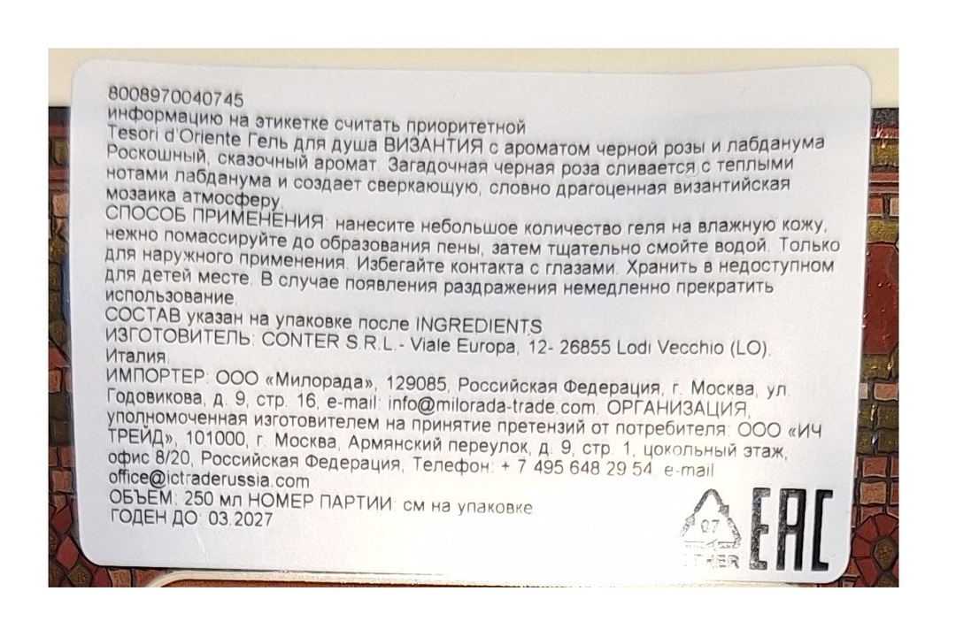 Гель для душа Tesori d'Oriente Византия с ароматом черной розы и лабданума 250 мл