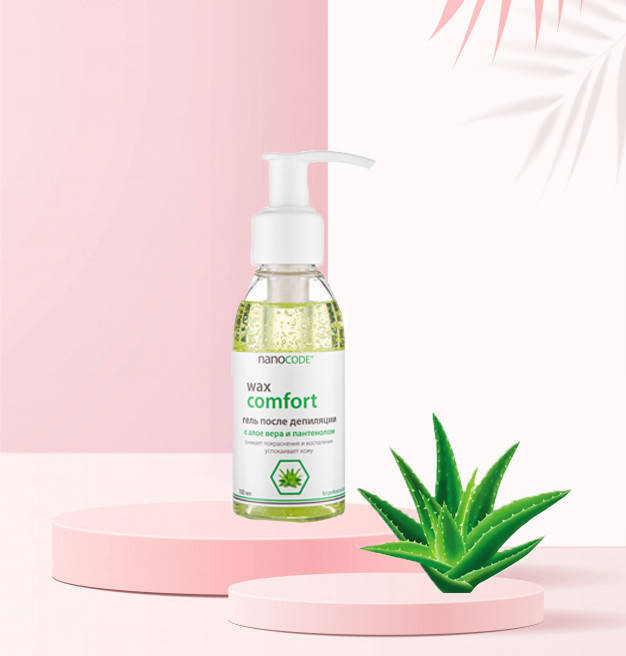 Гель после депиляции NANOCODE содержит натуральный сок листьев Алоэ Вера и Д-пантенол, подходит для всех типов кожи.